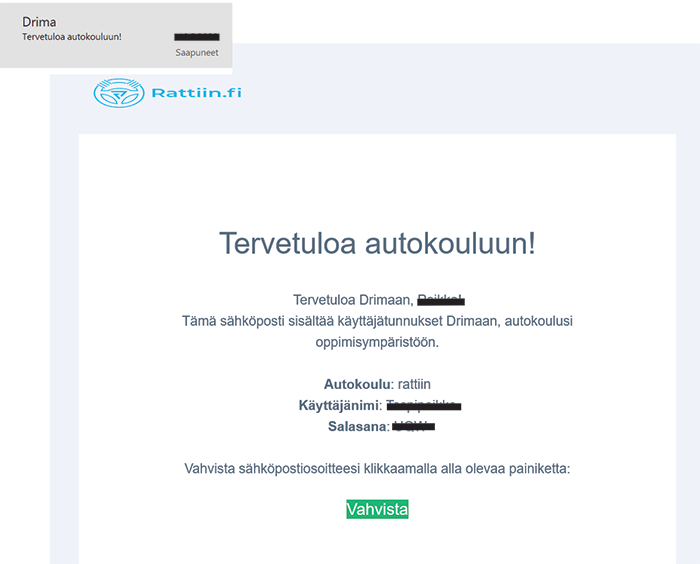- Jos et löydä tunnuksia tai olet vahingossa poistanut sähköpostin laita meille sähköposti info(at)rattiin.fi, niin lähetämme teille uudet tunnukset.